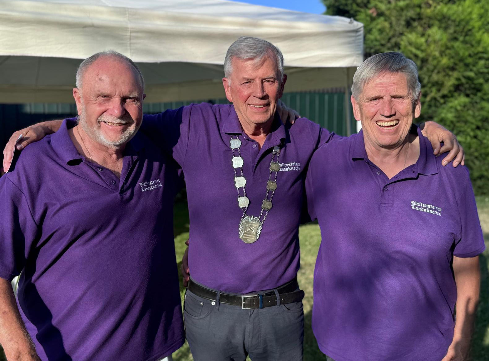 Peter Mertens gratuliert Franz-Gerd Arts und Karl Theo Wellmann zu 50 Jahre Wallensteiner Landsknechte